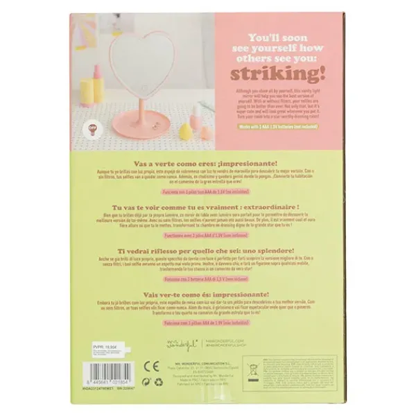 Incluye un mensaje en inglés en la superficie del espejo y una base que resulta ideal para colocar en ellos elementos de maquillaje o de otro tipo.