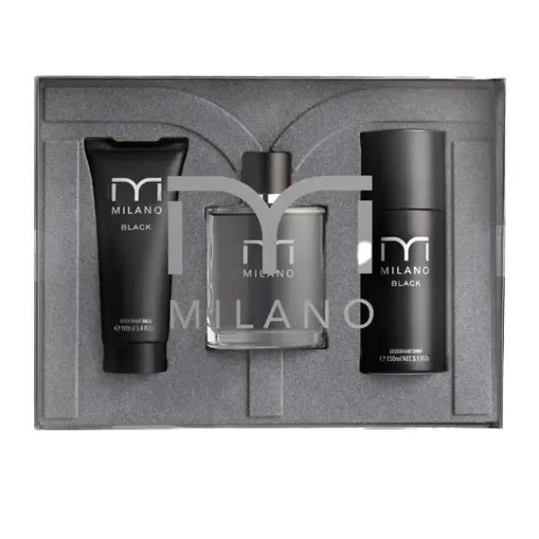 MILANO BLACK es una fragancia oriental que inicia con una combinación de drescor de la mandarina italiana y toques especiados de pimient roja y canela, entremezclándose con su corazón frutal y floral .
