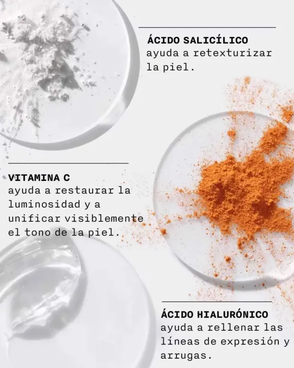 - Ácido salicílico: Ayuda a restaurar la luminosidad y retexturizar la piel.