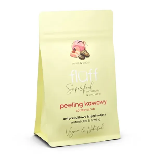 Fórmula de peeling seco reafirmante y anticelulítico con ingredientes 100% de origen natural: café robusta natural con azúcar moreno, semilla de fresa y vitamina E, aceite de almendras dulces y aceite de aguacate.