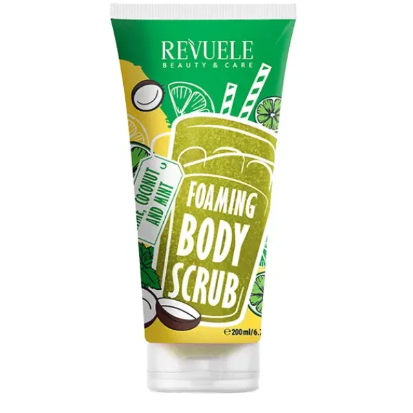 REVUELE FOAMING BODY SCRUB LIME, COCO AND MINT elimina suavemente las células muertas de la piel para una sensación instantáneamente más fresca y suave.