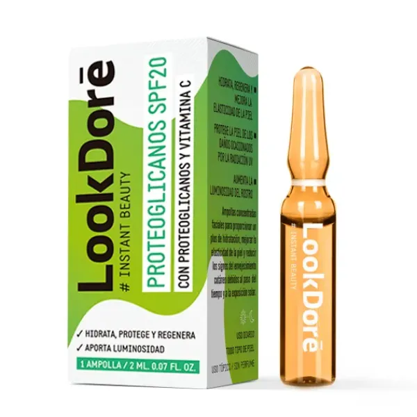 Ampollas concentradas con fotoprotector fluido SPF50, resistente al agua, que protegen la piel de las radiaciones UVB / UVA y de la polución, previniendo el envejecimiento prematuro de las células.