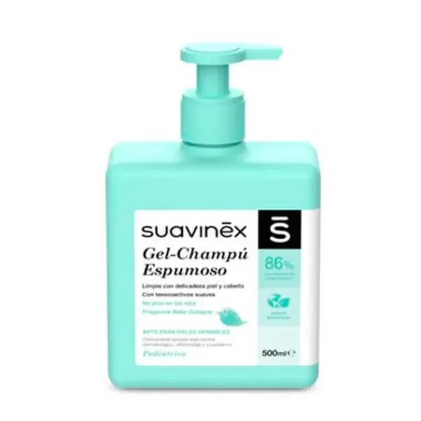 Gel-champú Espumoso Suavinex, limpia la piel y el cabello del bebé. No pica en los ojos.