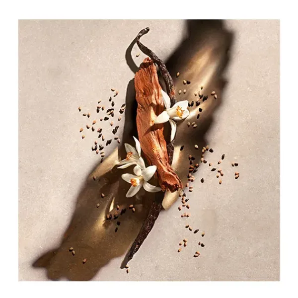 • El envolvente fondo mezcla sensuales notas de vainilla tostada y un acorde de cremoso sándalo para una estela de fragancia cautivadora.