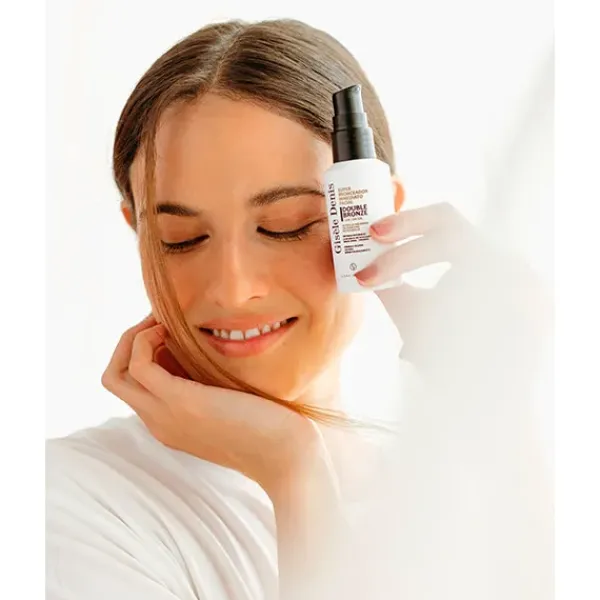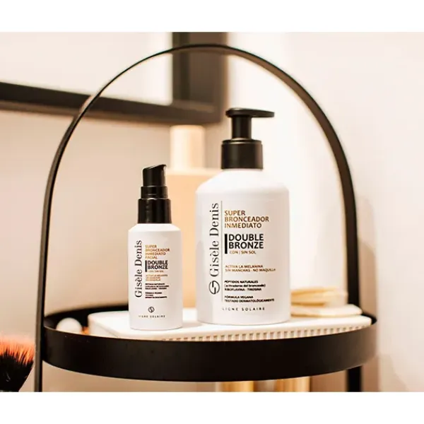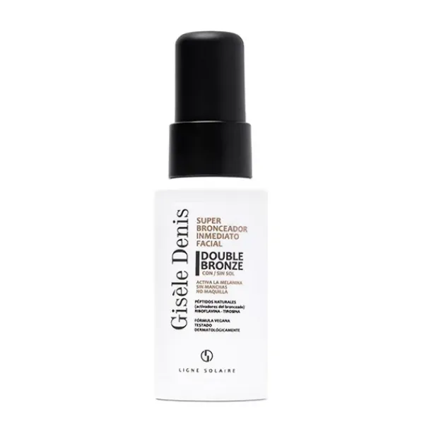 El Super Bronceador Inmediato Facial Double Bronze de Gisèle Denis genera y potencia el bronceado de forma natural proporcionando un tono dorado y uniforme en tu rostro. Su innovadora fórmula ejerce una doble acción sobre los melanocitos e incorpora activos que estimulan la síntesis de melanina para obtener un bronceado natural a partir de los cinco días de uso.