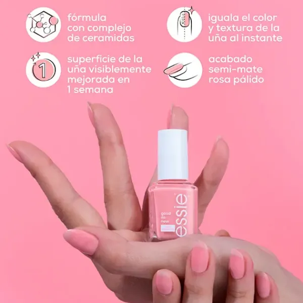 Esmalte de uñas perfeccionador Good as new de Essie con complejo de ceramidas al instante iguala el color y la textura de las uñas, en una semana mejora su superficie para unas uñas naturales y sanas.