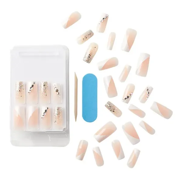 El kit contiene 30 uñas postizas, pegamento de gel rosa (2 g), mini lima y palito de manicura.