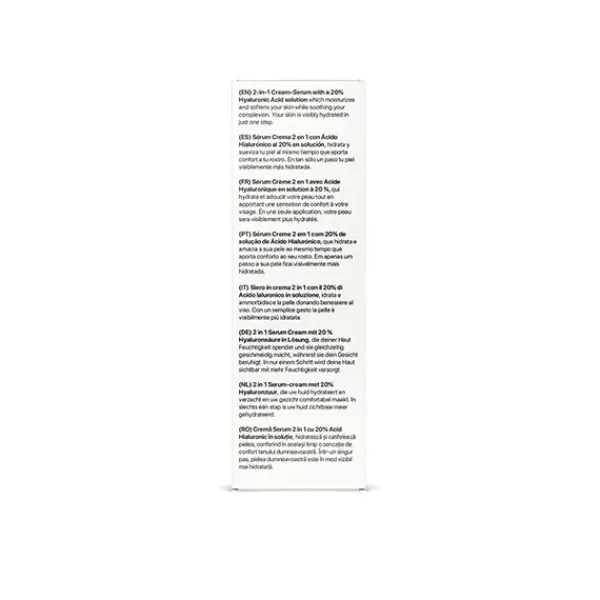 Sérum Crema 2 en 1 con Ácido Hialurónico al 20% en Solución, hidrata y suaviza tu piel al mismo tiempo que aporta confort a tu rostro.