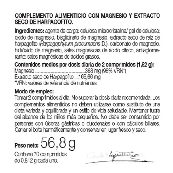 Extracto seco de harpagofito y 5 fuentes de Magnesio, entre ellas citrato de magnesio y bisglicinato de magnesio, que presentan una elevada biodisponibilidad y absorción. Esta combinación hace que sea el producto ideal para aquellas personas que necesitan un refuerzo de Magnesio y fortalecer el sistema locomotor.