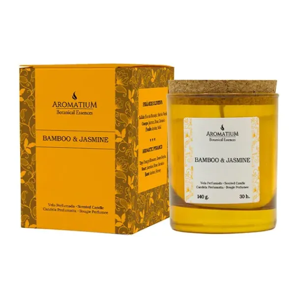 Vela de cera vegetal, presentada en vaso de cristal pintado 100% reciclable con tapa de corcho.