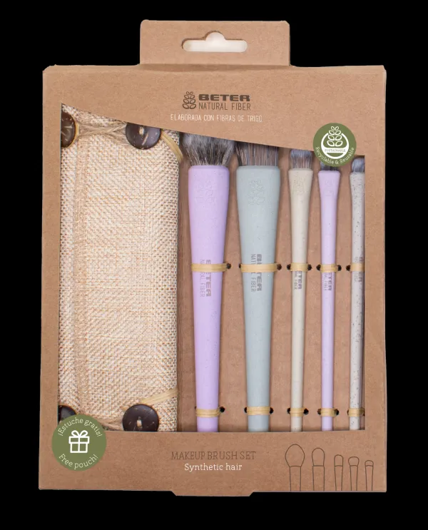 Estuche enrollable con 5 brochas y pinceles de pelo sintético y mangos elaborados con fibras de trigo.
