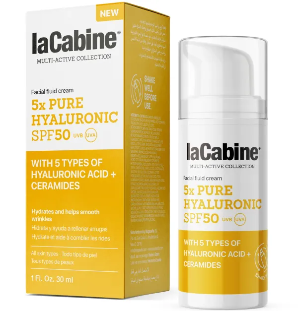 Crema facial con 5 tipos de ácidos hialurónico y SPF50 que suaviza las arrugas, hidrata y protege la piel en un solo gesto.