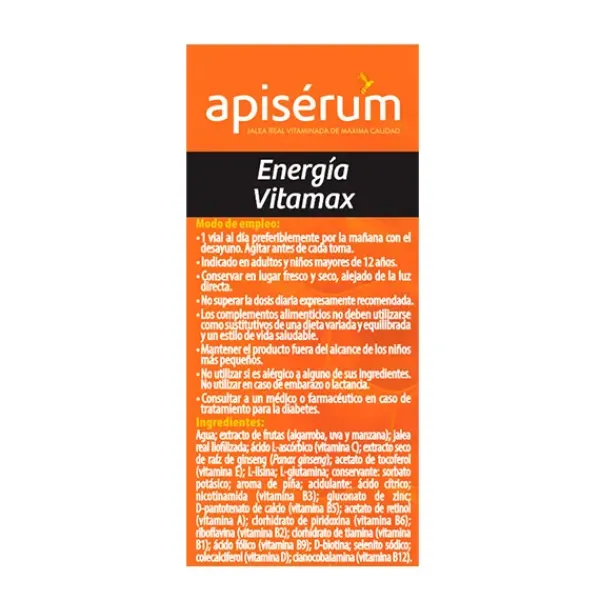 Apiserum Energía Vitamax es una combinación única de vitaminas, minerales, aminoácidos, jalea real y ginseng, que aportan una acción energizante.