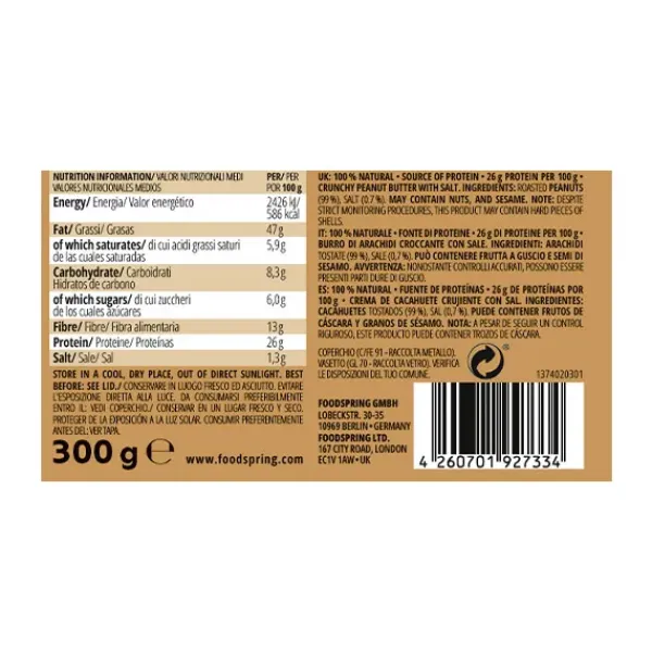 100% NATURAL*FUENTE DE PROTEÍNAS*26G DE PROTEÍNAS POR 100G*CREMA DE CACAHUETE CRUJIENTE CON SAL.