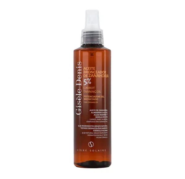 El Aceite Bronceador de Zanahoria 5% de Gisèle Denis es un spray de absorción rápida y acabado sedoso específicamente formulado para facilitar y potenciar el bronceado de la piel.