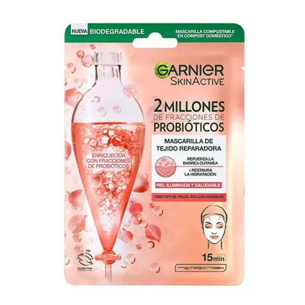 Garnier Tissue Mask Mascarilla Facial de Tejido Reparadora con 2 millones de fracciones de Probióticos para reparar intensamente la piel.