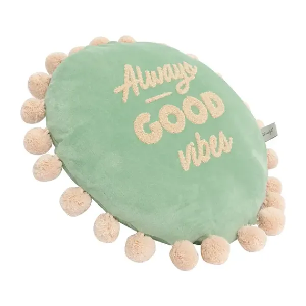 Cojín redondo realizado en algodón, con funda extraíble y con un mensaje bordado.