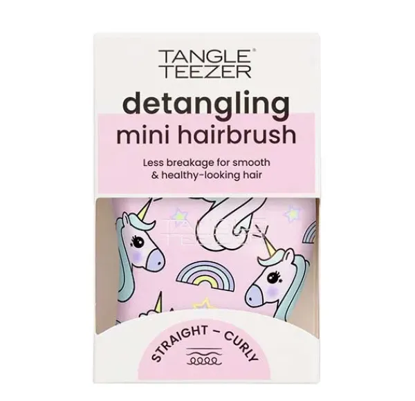 El Cepillo Mini Original Pink Unicorn presenta cerdas únicas que se deslizan sin esfuerzo por el cabello húmedo o seco para desenredar los nudos, sin engancharse ni tironear.
