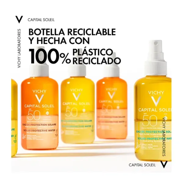 El envase está hecho con plástico 100% reciclado y reciclable. Se trata de una fórmula que protege la piel del daño solar a nivel celular con una sensación de agua, la alta protección UV nunca ha sido tan ligera.