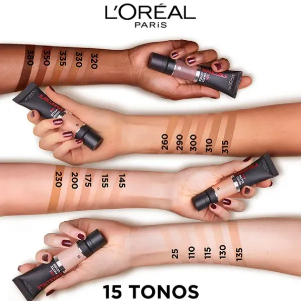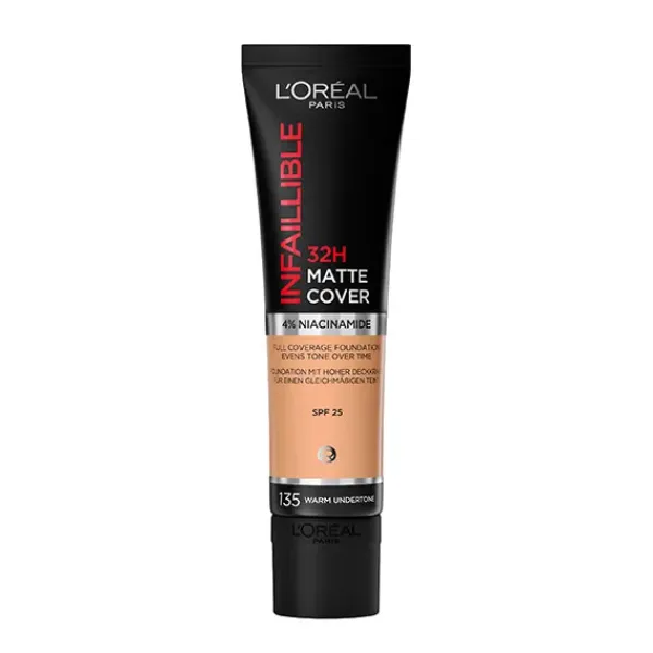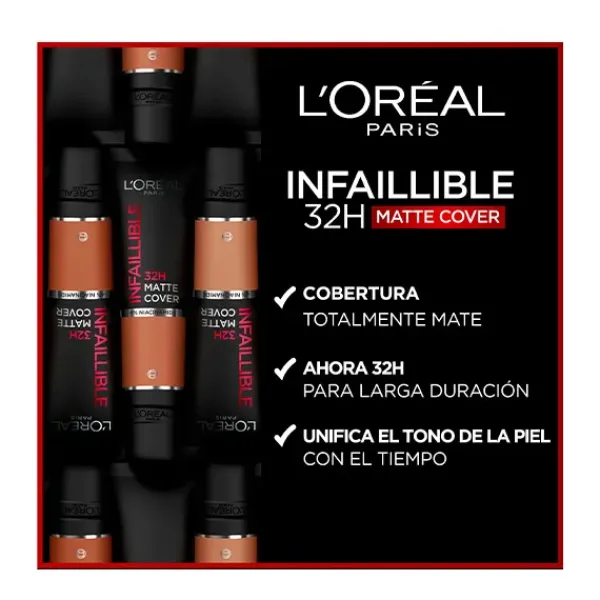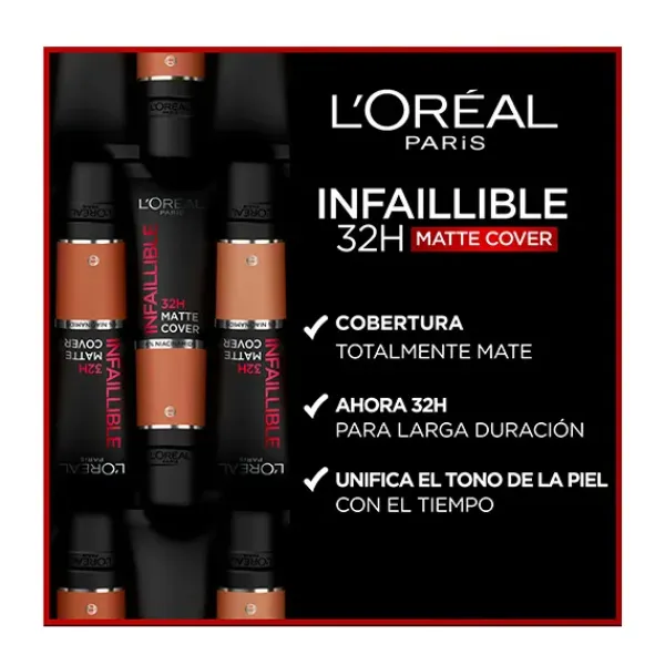 L'Oréal Paris Infalible 32h** Matte Cover base de maquillaje alta cobertura mate 30ml. con Niacinamida, protección solar SFP25 y resistente al agua.