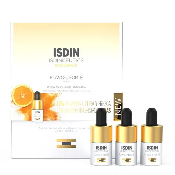 Flavo-C Forte es un potente sérum facial intensivo con un 15% de vitamina C pura y fresca que revitaliza, ilumina y ayuda a disminuir los signos de fatiga de la piel.