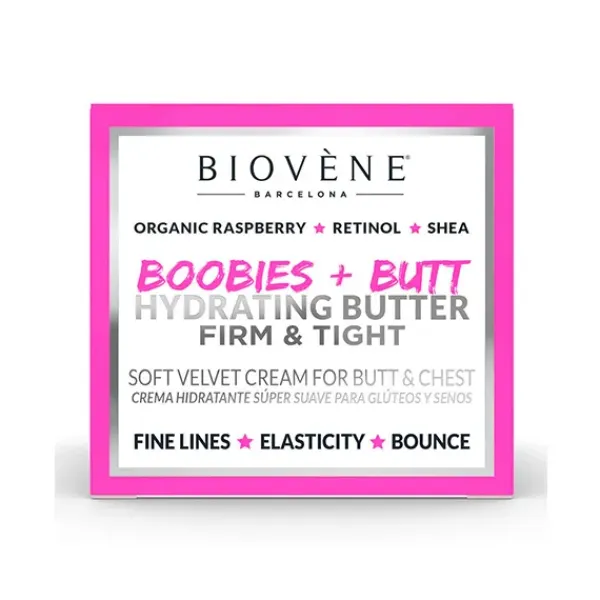 Manteca corporal ultrahidratante para glúteos y senos con frambuesa orgánica rica en antioxidantes, retinol y karité para ayudar a mejorar la textura de la piel, recuperar la elasticidad y minimizar la aparición de líneas finas y arrugas con una piel más firme y tersa.