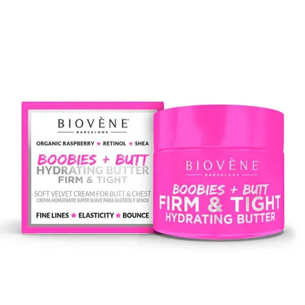Manteca corporal ultrahidratante para glúteos y senos con frambuesa orgánica rica en antioxidantes, retinol y karité para ayudar a mejorar la textura de la piel, recuperar la elasticidad y minimizar la aparición de líneas finas y arrugas con una piel más firme y tersa.