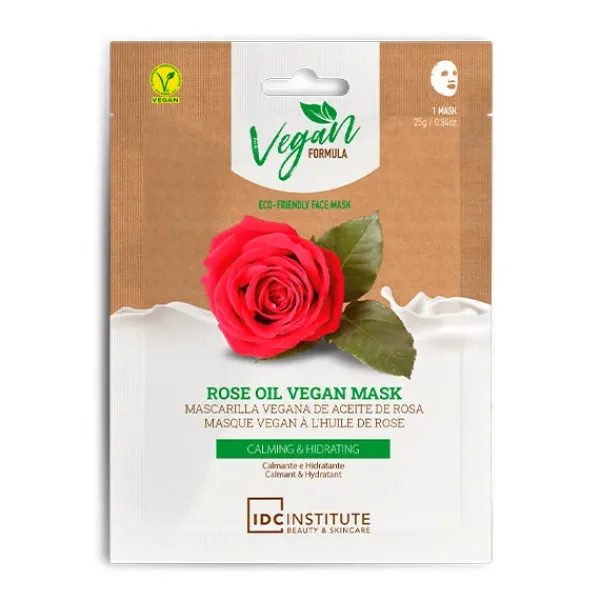 Mascarilla vegana en formato papel impregnado de aceite de rosa con efecto calmante e hidratante.