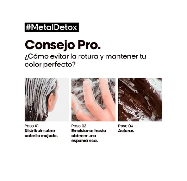 Co-desarrollado con peluqueros expertos, este champú combina una serie de beneficios excepcionales para mantener tu cabello en su mejor estado y prolongar la duración de tu color, balayage y decoloración. Evita la rotura y mantén tu color perfecto con la gama Metal Detox, que previene los daños de tu cabello y aporta un brillo duradero.