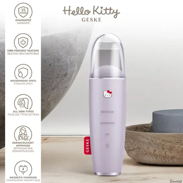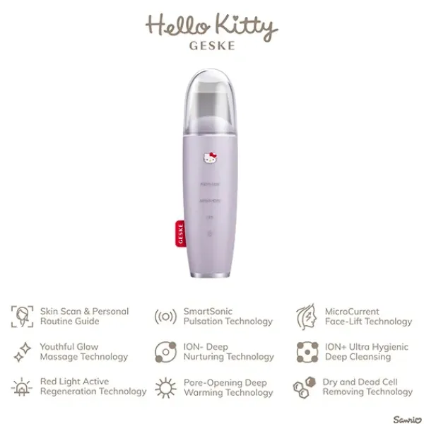 ¡No busques más! Despídete de los puntos negros y las imperfecciones a la vez que limpias tu rostro y le das un efecto tonificante con SmartAppGuided™ MicroCurrent Skin Scrubber & Blackhead Remover | 9 in 1 en un adorable diseño de Hello Kitty.