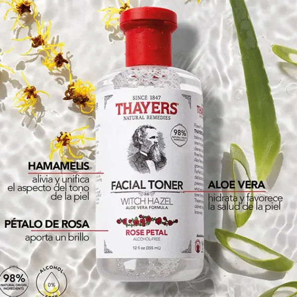 Descubre el tónico facial de Thayers de Pétalos de Rosa con tratamiento para darle brillo natural a tu piel.