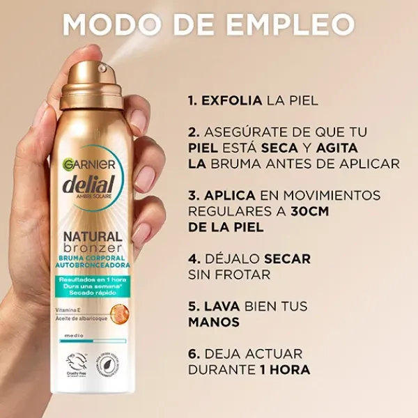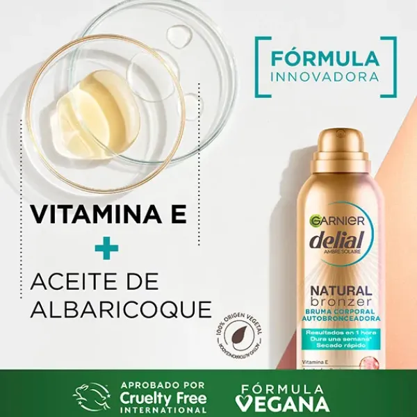 Natural Bronzer bruma autobronceadora para cuerpo con aceite de albaricoque nutritivo para un bronceado sin marcas natural y uniforme.