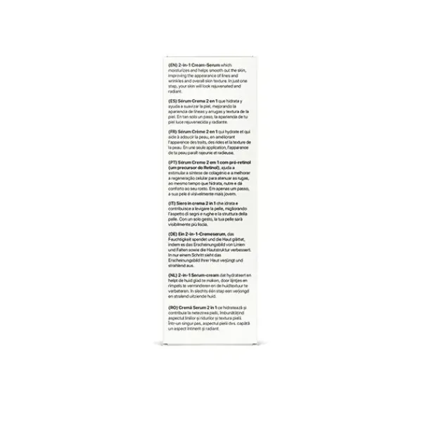 Sérum Crema 2 en 1 con pro-retinol al 0,3% (un precursor del Retinol), ayuda a estimular la síntesis de colágeno y a mejorar la regeneración celular para difuminar las arrugas, al mismo tiempo que hidrata, nutre y aporta confort a tu rostro.