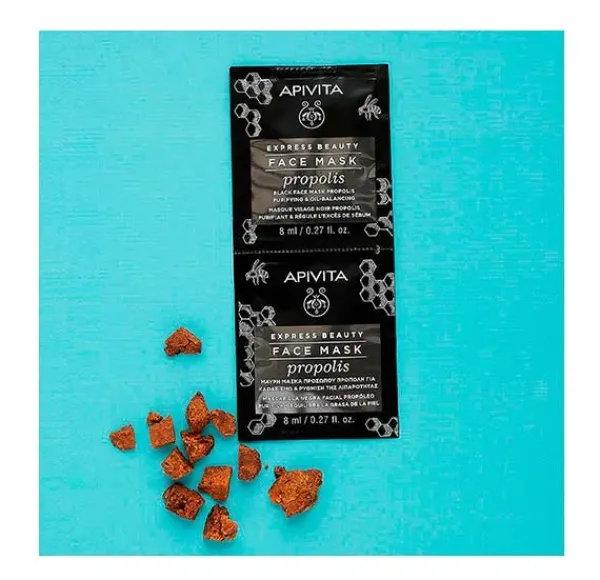 La mascarilla facial negra con propóleo EXPRESS BEAUTY, una cura tradicional de la región mediterránea, conocida por su acción antibacteriana, limpia en profundidad y equilibra la grasa de la piel.
