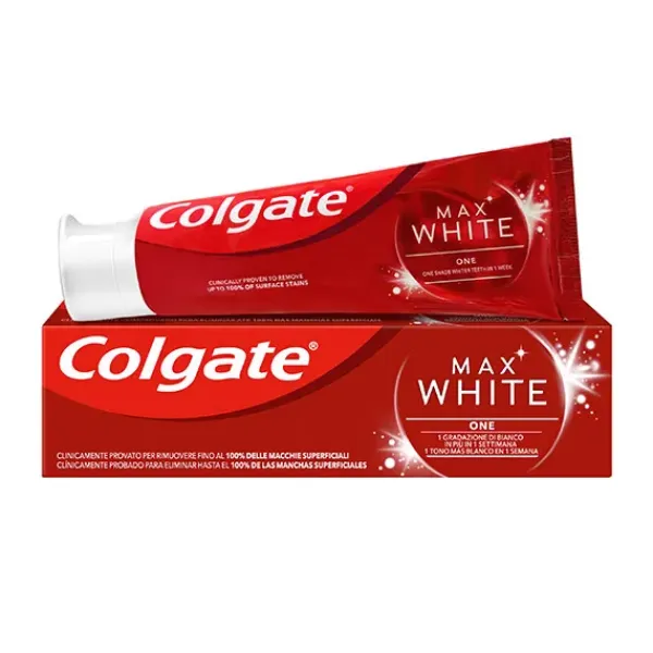 Colgate Max White One es una pasta de dientes blanqueadora con flúor para conseguir un tono más blanco en una semana. Está clínicamente probado que elimina hasta el 100% de las manchas superficiales.