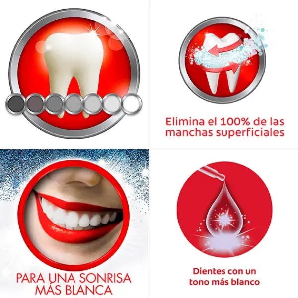 Tecnología Colgate: Contiene un sistema avanzado que elimina hasta el 100% de las manchas superficiales.