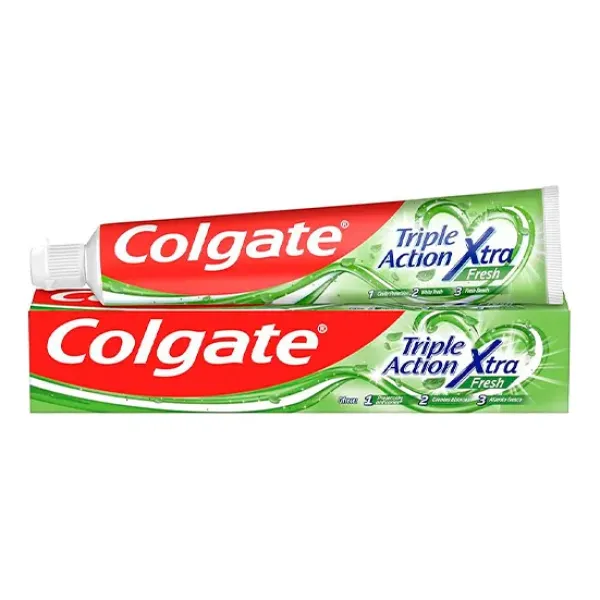 Colgate Triple Action Xtra Frash es una pasta de dientes con flúor. Ayuda a prevenir la caries, elimina las manchas de la superficie y previene el mal aliento con menta original. Aporta un triple beneficio con una protección anticaries probada.