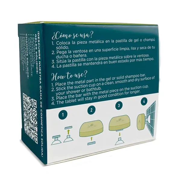 Imán portasólidos de Dr. Tree, con el que podrás tener tus champús y géles sólidos a salvo y en bues estado por más tiempo en la ducha, sin preocuparte de la incomodidad de que se escurran las pastillas al estar mojadas. Sólo tienes que apretar la pieza metálica sobre la pastilla para que se quede dentro de este, y fijar la ventosa a la pared de la ducha. Sigue los siguientes pasos:
