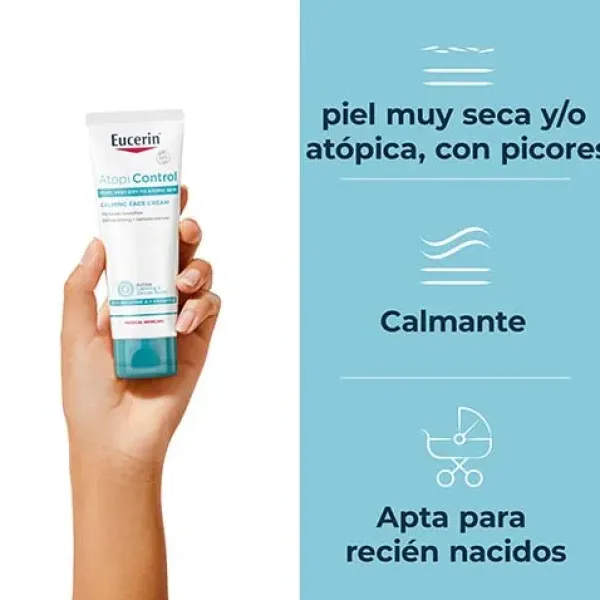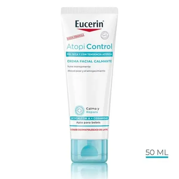 Contiene un 12% de ácidos grasos omega-6 para calmar y nutrir la piel seca, cuarteada, y también tiene el antiinflamatorio y antirritante licocalcón A, por lo que Eucerin AtopiControl Crema Facial hidrata, suaviza y reduce la sequedad, a la vez que alivia la piel sometida a picor y con aspereza. La piel se nota suave y muy hidratada. Clínicamente probada en su compatibilidad con la piel atópica y se puede utilizar en niños y bebés a partir de los tres meses de edad.