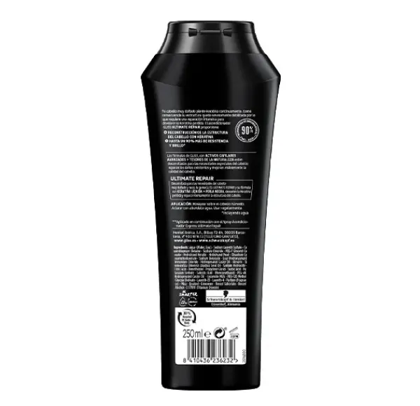 Ultimate repair: Este champú para cabellos dañados rellena con precisión las queratinas perdidas y repara intensamente la estructura capilar, ayudando a combatir la estructura debilitada del cabello.