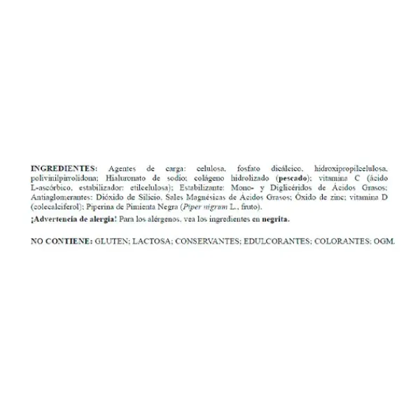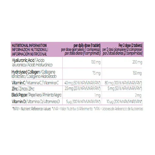 El comprimido contiene la dosis óptima de ácido hialurónico junto con colágeno hidrolizado, extracto de pimienta negra, vitaminas y minerales que han sido cuidadosamente seleccionados por su capacidad para mejorar la hidratación y aportar juventud a la piel.