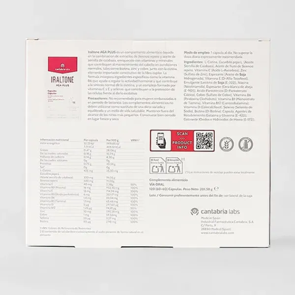 Este pack formato ahorro incluye 120 cápulas de Iraltone AGA Plus: Complemento alimenticio con extractos de Serenoa repens y aceite de semilla de calabaza, enriquecido con vitaminas y minerales como biotina, zinc y cobre, que contribuyen al mantenimiento del cabello en condiciones normales.