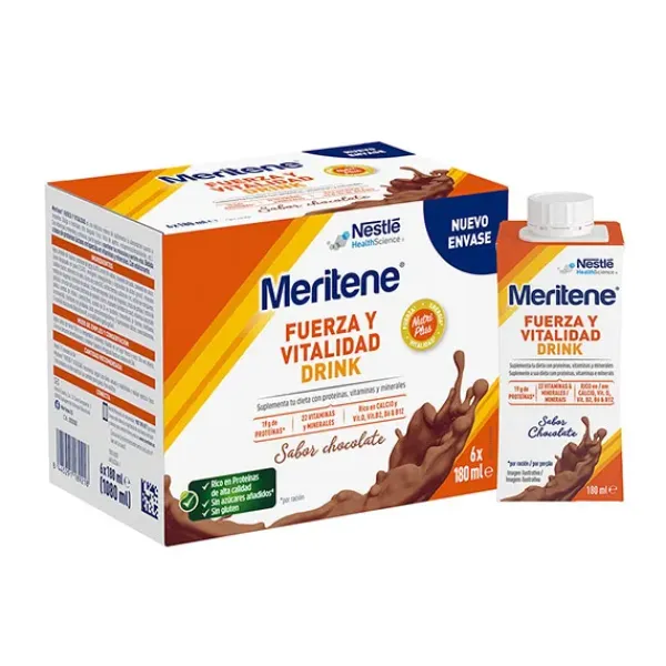 Meritene FUERZA Y VITALIDAD Pack 6 briks de 180 ml con sabor a Chocolate es una solución nutricional en formato bebible listo para tomar. Su fórmula NutriPlus contiene proteínas, de alta calidad, vitaminas y minerales. Sus ingredientes permiten suplementar la dieta, contribuyen a disminuir el cansancio y la fatiga y al funcionamiento normal del sistema inmunitario.
