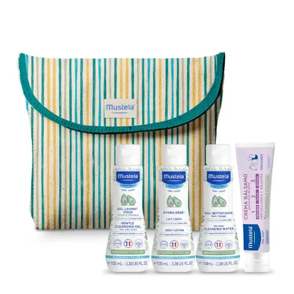 Neceser 100% algodón confeccionado en Europa con un print trendy con todos los productos necesarios en formato viaje para el cuidado del bebé: