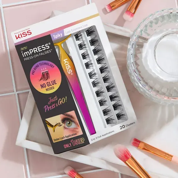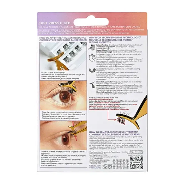¿La mirada perfecta en un solo paso? Es posible con las imPRESS Falsies Cluster de KISS, que revolucionan por completo su juego de pestañas gracias a la tecnología de preadhesión: Un adhesivo sensible a la presión ya está adherido a las pestañas artificiales, que se adhieren inmediatamente cuando se pegan a la línea de las pestañas naturales y después ¡hasta 24 horas!