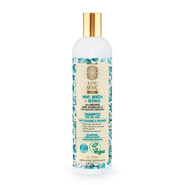 El champú profesional menta, abedul y retinol, basado en hidrolato de menta siberiana orgánico, limpia el cabello y el cuero cabelludo en profundidad, lucha contra la caspa y otorga al cabello una sensación de frescor y suavidad duradera.