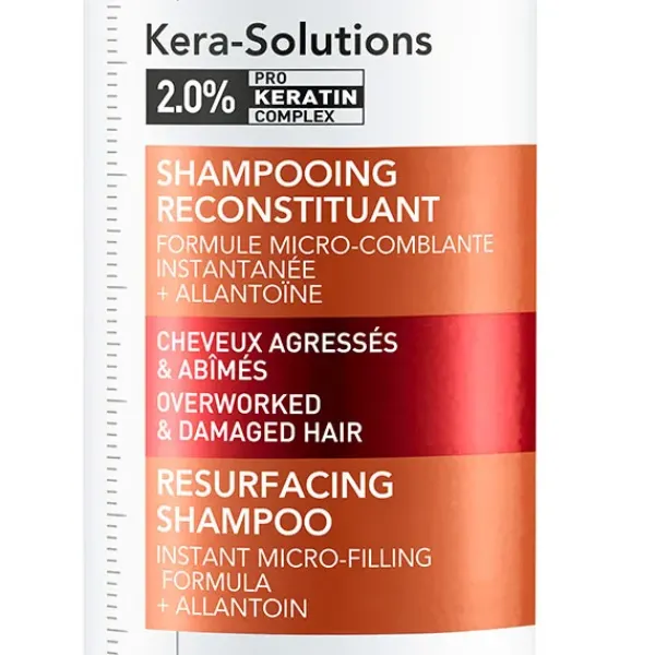El champú reparador Kera-Solutions combina una fórmula de microrellenado con complejo Pro-Keratin para reparar el cabello después de un solo uso.
