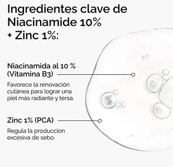 El sérum Niacinamide 10% + Zinc 1% es una fórmula a base de agua que ofrece los múltiples beneficios de la niacinamida para mejorar el brillo de la piel, mejorar la textura y reforzar la barrera de hidratación de la piel. Este sérum con niacinamida (vitamina B3) contiene una concentración alta (10 %) y zinc PCA para combatir la opacidad, la textura irregular y el exceso de grasa. Niacinamide 10% + Zinc 1% también ayuda a reducir la apariencia de los poros y aumenta al instante la luminosidad de la piel.