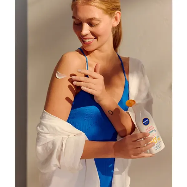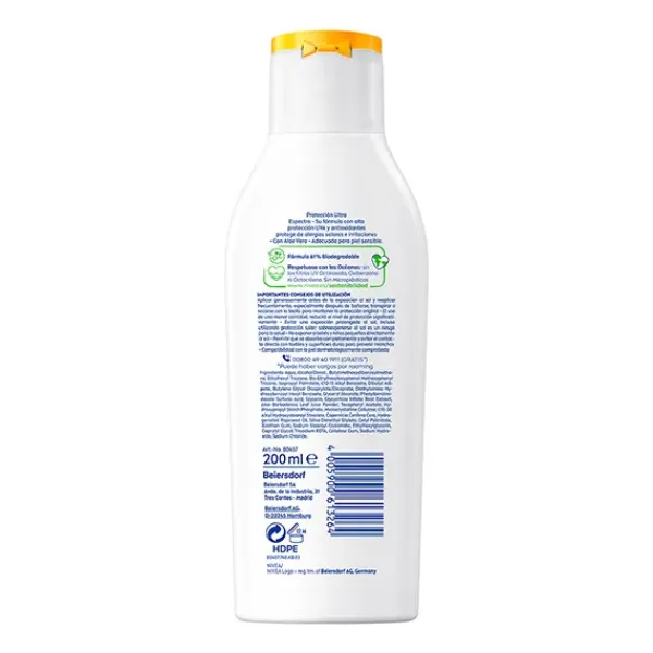 NIVEA SUN Sensitive Antialergias Solares Loción Solar FP50+, con su fórmula con protección inmediata y muy alta frente a los rayos UVA/UVB y con antioxidantes, protege la piel de las alergias solares e irritaciones. Especialmente indicada para piel sensible, su fórmula sin perfume con Aloe Vera Bio y antioxidantes es resistente al agua.