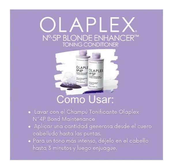 El acondicionador nutritivo nº5P de la marca Olaplex que neutraliza los tonos amarillos no deseados de la raíz a las puntas, fija el brillo, suaviza, desenreda y fortalece el cabello. Con los usos, los cabellos rubios y grises se vuelven más brillantes y uniformes con un aspecto saludable.